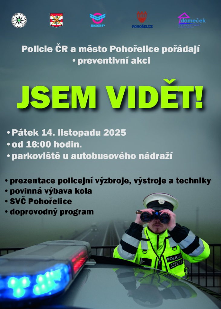Policie ČR a město Pohořelice pořádají v pátek 14. listopadu od 16:00 hodin. na parkovišti u autobusového nádraží preventivní akci JSEM VIDĚT!