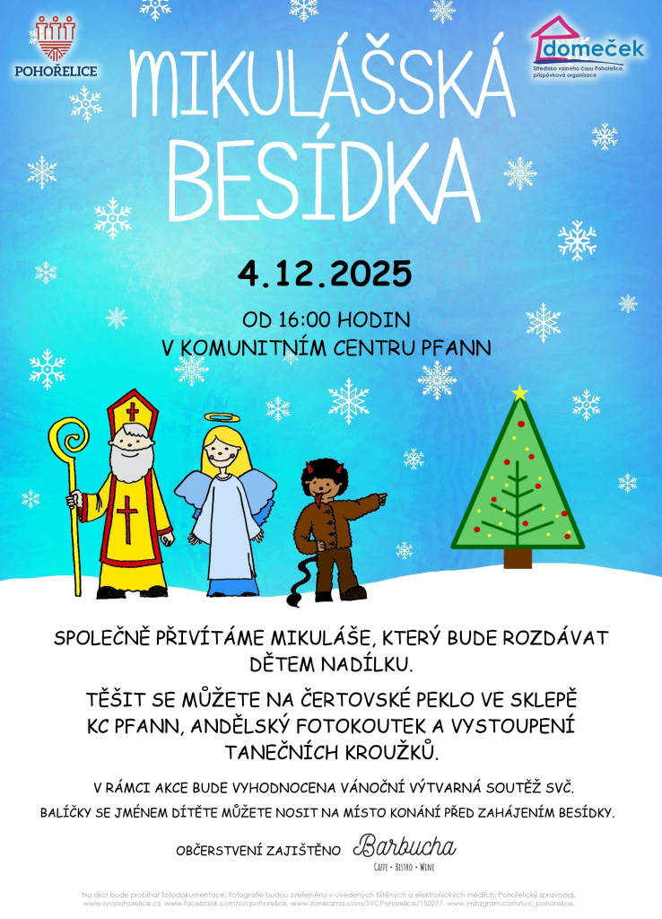 Zveme vás na Mikulášskou besídku, která se uskuteční ve čtvrtek 4. prosince od 16:00 hodin v areálu Komunitního centra Pfann. Společně přivítáme Mikuláše, který bude rozdávat dětem nadílku (balíčky se jménem dítěte můžete nosit na místo konání před zahájením besídky). Těšit se můžete na čertovské peklo ve sklepě KC Pfann, andělský fotokoutek a vystoupení tanečních kroužků. V rámci akce bude vyhodnocena také vánoční výtvarná soutěž o nejkrásnější vánoční stromeček.