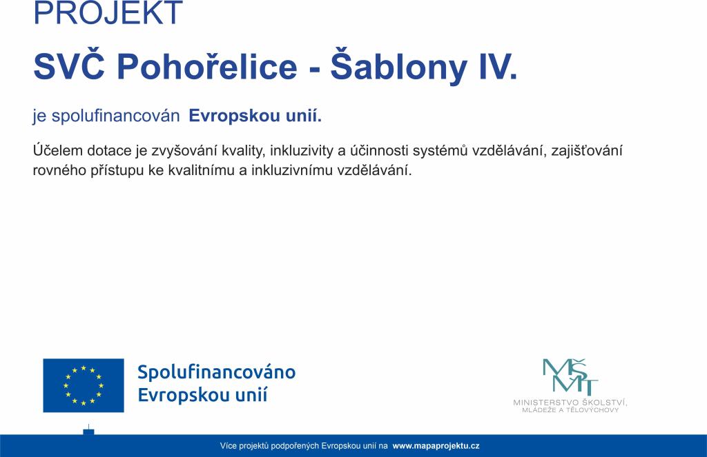 PROJEKT SVČ Pohořelice - Šablony IV. je spolufinancován Evropskou unií. Účelem dotace je zvyšování kvality, inkluzivity a účinnosti systémů vzdělávání, zajišťování rovného přístupu ke kvalitnímu a inkluzivnímu vzdělávání.